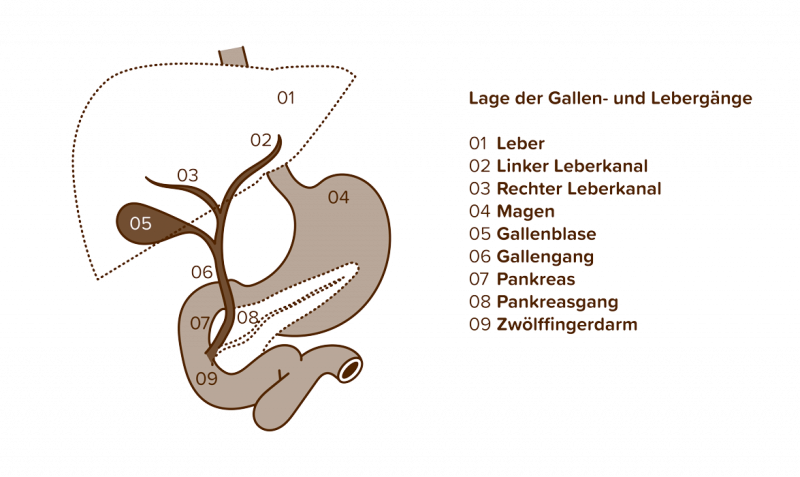Die Katze hat eine anatomische Besonderheit: Das Ausscheidungssystem besteht nur aus dem Hauptpankreasgang, der in den Gallenblasengang (Choledochus) mündet, bevor er an der Papilla duodeni major in den Zwölffingerdarm (Duodenum) mündet.