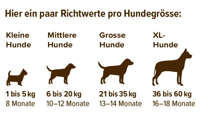 Je kleiner eine Hunderasse ist, desto schneller ist sie ausgewachsen, und man kann auf Hundefutter «Adulte» umstellen.
