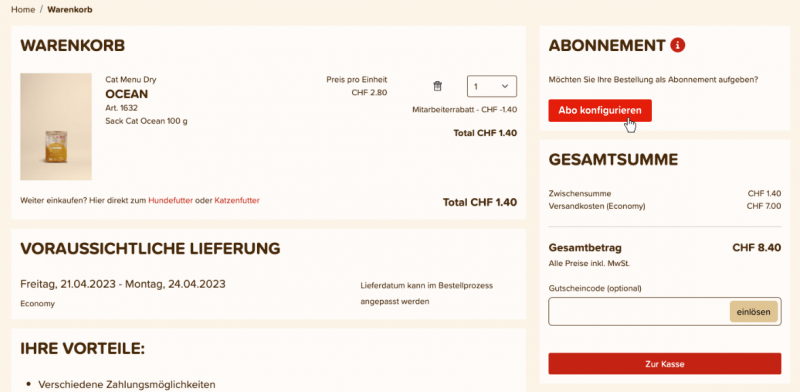 Du wirst dann zum Warenkorb weitergeleitet. Dort kannst du Produkte entfernen oder hinzufügen und das Abo wie oben beschrieben erneut anlegen.
