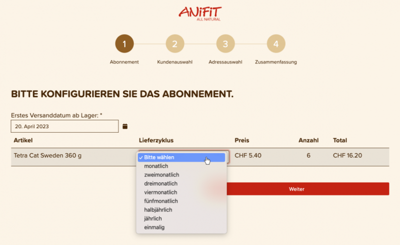 Bestimme anschliessend das erste Versanddatum und wie oft du das Produkt geliefert haben möchtest (Lieferzyklus: monatlich, zweimonatlich usw.).